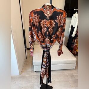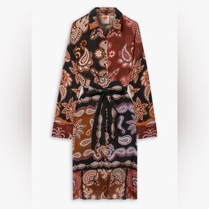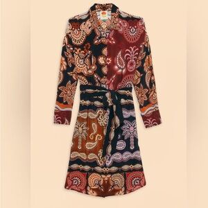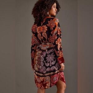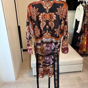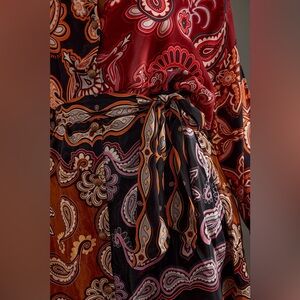 Stylish long sleeve dress with vibrant paisley print. Features a mix of red, orange, and black colors.