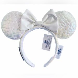 This pearly white accessory, with iridescent details, makes an elegant and fun addition to a festive occasion. A quilted pattern covers the front and back, with molded pearl decorations in the shape of Disney’s Mickey Mouse ears at various diamond points.