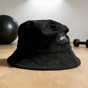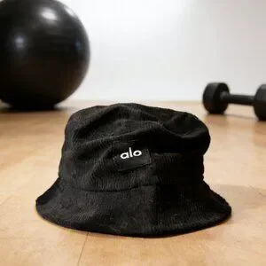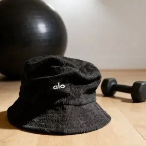 Made from thick, durable corduroy in a deep jet black shade, this Alo bucket cap boasts a structured crown with a gently sloped brim for a timeless silhouette. The brand’s "alo" logo is printed in crisp white on a small fabric patch sewn to the side, creating a striking contrast against the rich corduroy texture. The soft, breathable material ensures all-day comfort, while the wide brim shields the face and neck from UV rays and wind. Perfect for urban outings or weekend adventures, it complements hoodies, leather jackets, and activewear with effortless cool.