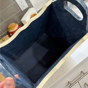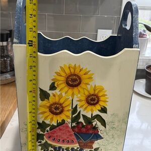 Hand-painted wooden tote featuring three bright sunflowers. Accented with a painted watermelon and berries. Cream background with blue interior and handle details. Charming floral fruit artwork. Ready to display or use.
