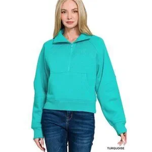 *This stylish turquoise quarter-zip pullover sweatshirt is perfect for casual wear. Made from a soft and comfortable blend of cotton and polyester, it features a quarter-zip closure, a front pouch pocket, and raglan sleeves for a relaxed fit. The ribbed cuffs and hem add a touch of detail, while the versatile design makes it easy to layer. This sweatshirt is a must-have for any wardrobe.