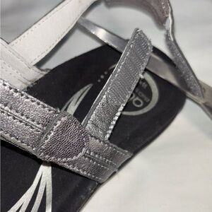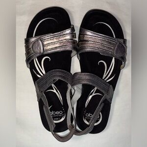 Abeo Bio Systems Women's Metallic 2 Toned Silver Strappy Adjustable Comfort Sandals. Three Velcro closures - on top of foot, at toe area, and heel strap for the perfect fit. Cushioned footbed and padded heel strap for all day comfort wear. One each sizes 8, 8.5, and 9 available. New without tags see photos for any imperfections or markings.