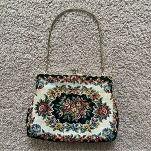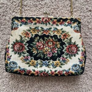 Vintage Floral Petit Point Needlepoint Tapestry Bag Gold Handle Dainty Evening
