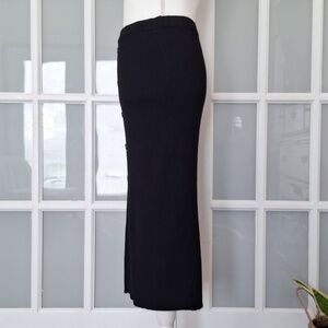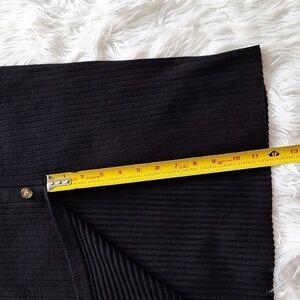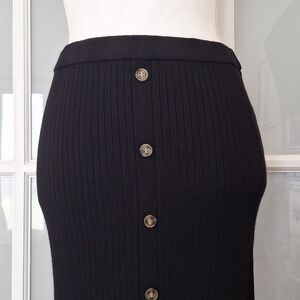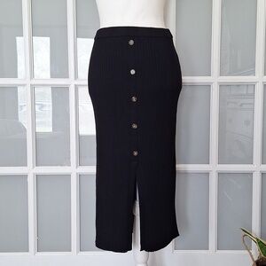 Figure flattering ribbed knit midi skirt with faux buttons down the front and a front slit. Perfect staple to have in your closet.