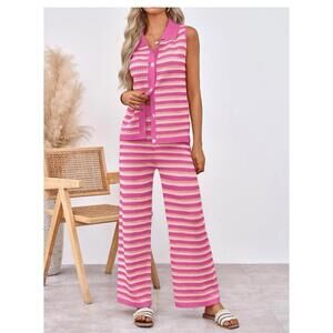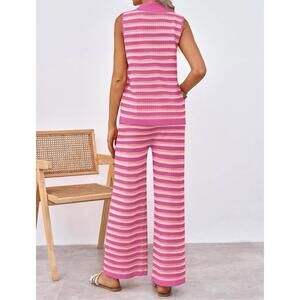 Womens Sleeveless Striped Pajama Sets Color Block Crochet Knit Button Top Pants 2 Piece Lounge Sets