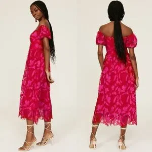 Get crowned the best-dressed guest in this floral lace ML Monique Lhuillier dress designed to show off your shoulders and your shoes.
