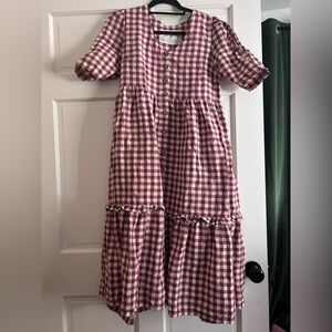 Discontinued style Elysian Dress with Rhonda sleeves and a more open neckline. Color is Marsala Gingham. Ptp ~18.5”, total length ~44”, bodice ~13.5”