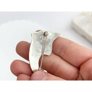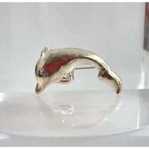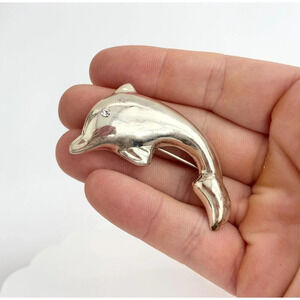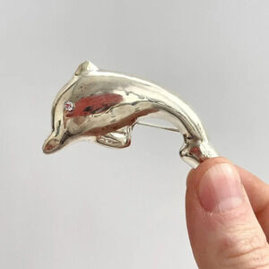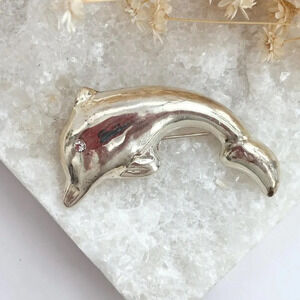 Lovely sterling polished silver dolphin shaped brooch. Marked as 925 and tested positive as such when checked. Enclosure is c clasp style. 3 dimensional. Abaolutely lovely, wonderful gift idea for your dolphin loving friends. Little cubic zirconia stone at the eye.