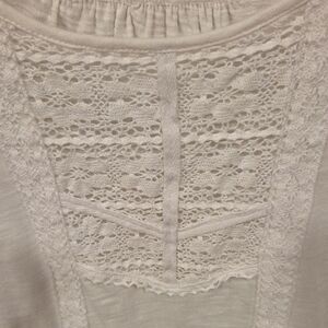 Delicate white camisole with lace yoke and cap sleeves. Decorative lace panel down the front. Soft, lightweight fabric for easy wear. Feminine and versatile styling.Size Med
