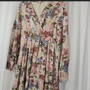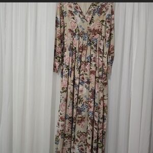 Flowy maxi dress with a soft V-neck. Long sleeves and a gathered waist for a feminine fit. Romantic floral print in muted tones. Lightweight fabric for easy wear. Ideal for daytime events and garden parties.