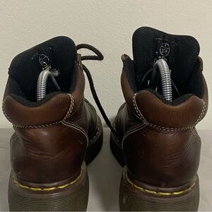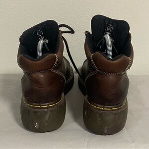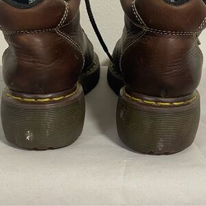Classic Dr. Martens lace-up boots. Full-grain brown leather upper. Stitched welt with yellow accent. Thick cushioned sole for support. Timeless work-to-casual style.