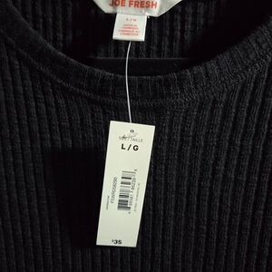 Sleeveless ribbed midi dress by Joe Fresh. Soft knit fabric with a subtle texture. Fitted bodice flowing into a gentle A-line skirt. Round neckline and clean, minimal design. Versatile piece for day or evening wear.