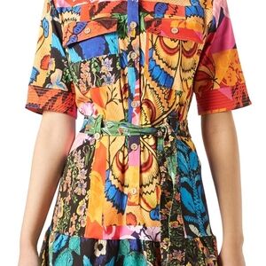 Vibrant floral button-up shirt. Bold multicolor print with pink, orange, blue, yellow and black. Single breast pocket detail. Eye-catching pattern perfect for statement looks.