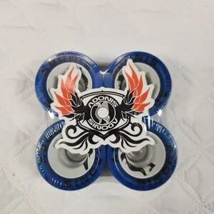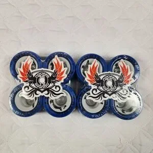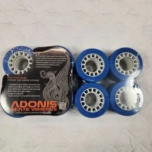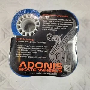 Bright Blue Adonis 50mm x 36mm roller skate wheels with bold logo. Smooth 95A urethane surface. Graphic inner design.