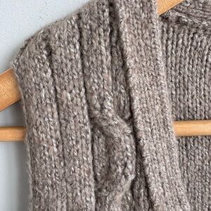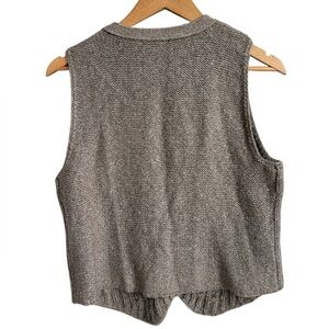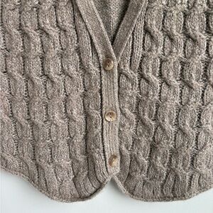 J.Jill sleeveless sweater vest in a versatile taupe / oatmeal heather tone. Features a beautiful textured cable knit, flattering V-neckline, and button-front closure