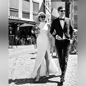 Channel your inner Meghan Markle with this sleek and sophisticated crepe dress featuring a high-neck and deep slit.