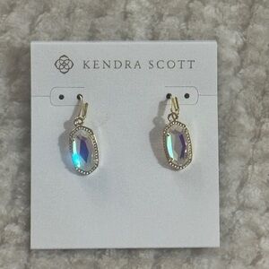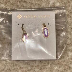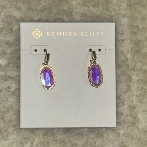 Never Worn. Kendra Scott drop earrings with iridescent purple stones. Gold-tone frames add shine. Dangle style for a subtle statement. Versatile for day or night wear.