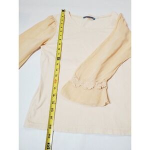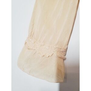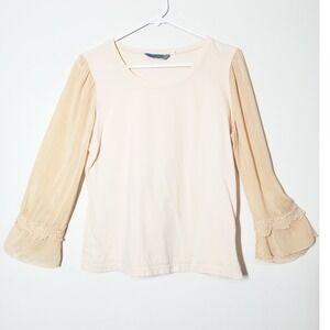 Vintage 90s Johnny Was women's cream scoop neck top with sheer lace bell sleeves by Johnny Was. This top offers a comfortable fit with elegant detailing on the sleeves, perfect for a casual day out or a chic evening gathering.