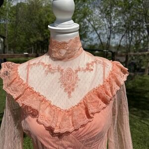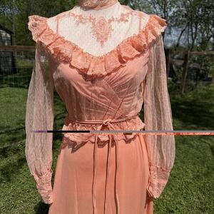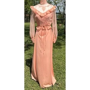 Vtg 70s Peach Lace Maxi Dress Sheer Sleeve Prairie Romantic Union Made Victorian size 9/10