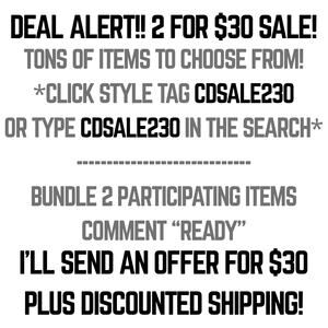 DEAL ALERT! Check out this awesome SALE! BUNDLE THIS ITEM WITH ANOTHER 2/$30 ITEM IN MY CLOSET, COMMENT "READY" AND I'LL SEND $30 OFFER WITH DISCOUNTED SHIPPING! There are tons of participating items to choose from. To find these items, type CDSALE230 in the search bar or click the CDSALE230 style tag on this listing!
