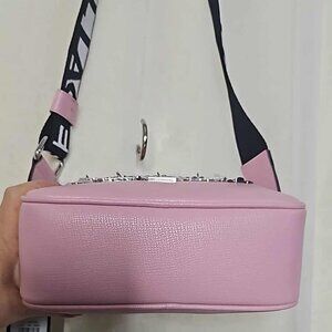 Karl Lagerfeld Paris Maybelle crossbody bag in blush pink, featuring dangling Eiffel Tower and iconic KL charms.