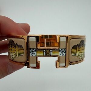 Authentic Hermès Clic H bracelet in rose gold with beautiful enamel detailing. This bracelet is brand new and has never been worn. Comes with full set including original Hermès box and dust bag, making it perfect for gifting or adding to your collection.