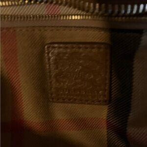 Classic Burberry leather satchel. Rich brown leather body with gold-tone hardware accents. Structured top handles and exterior pleated detailing. Polished gold buckles and zipper pulls. Timeless, versatile style.