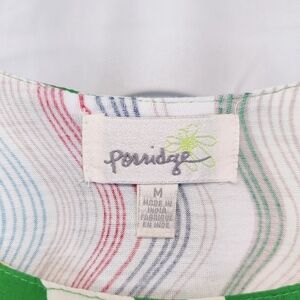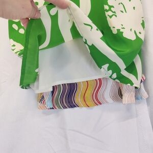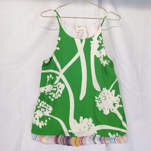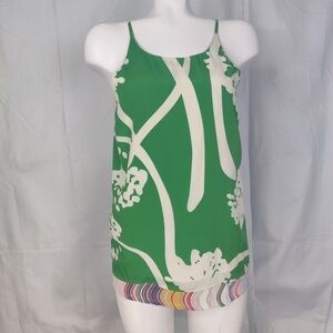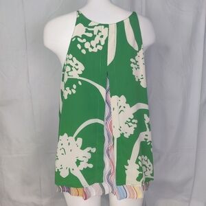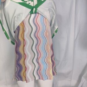 Sleeveless tank with a relaxed fit. Bold green background with cream floral print. Center slit reveals multicolor wavy striped panel. Lightweight and breezy for warm days.