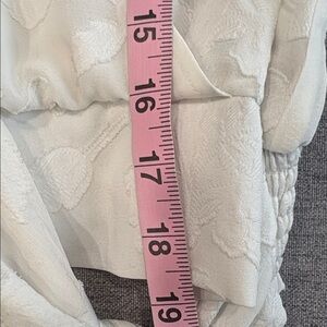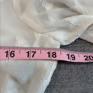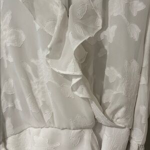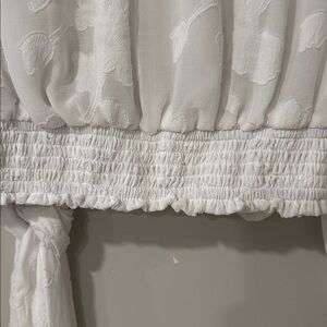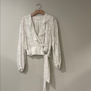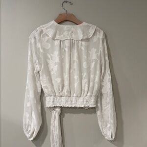 Sheer floral burnout overlay with a flattering tie-waist wrap silhouette and smocked cuffs.