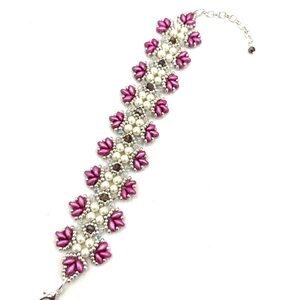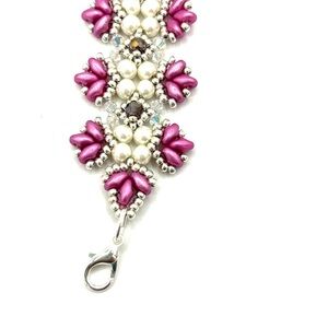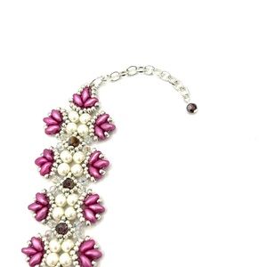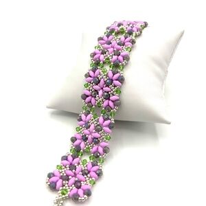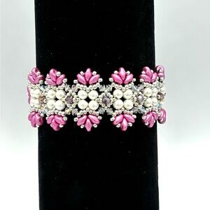 Made with pink duo beads, ivory faux pearl, purple crystal and silver seed beads woven into a Victorian style pattern.