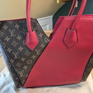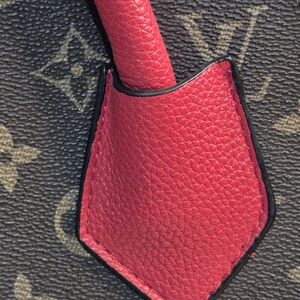 Louis Vuitton two-tone tote in vibrant red leather with classic monogram canvas panels. Stylish V-shaped design and dual top handles for easy carrying. Versatile look that pairs with day or evening outfits. Red accent provides a bold, modern pop against the monogram print.