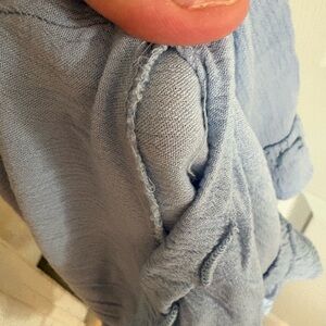 Light blue mini dress with crochet bodice and adjustable spaghetti straps. Tiered, ruffled skirt adds movement. Soft, breezy fabric for warm days. Feminine V-neck silhouette.