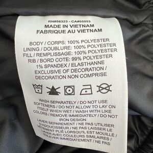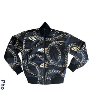 Nike Women’s satin black with gold chain bomber jacket. So you’ve got some swag in this satin bomber jacket printed with trompe l’oeil chai so featuring Nike swishes and just do it bling. Front zip closure. Two front pockets and one buttoned in turtle pocket. Stretchy ribbed knit cuffs and him. Lined with synthetic fiber fill. 100% polyester. Excellent like new condition. Women’s size extra small. Measures approximately 21 inches flat across chest from armpit to armpit, 24 inches in length, and 22 inch sleeve from shoulder seam.