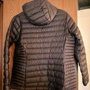 Lightweight insulated hooded jacket with quilted baffles. Full-length front zipper. Zippered hand pockets. Small Patagonia logo on chest. Women’s XL. Great condition.