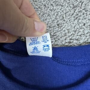 Design details: Classic crew neckline, short sleeves, straight hem, pullover construction, and large center front team and mascot screenprint; back of shirt is solid blue with no additional graphics.