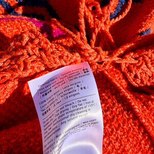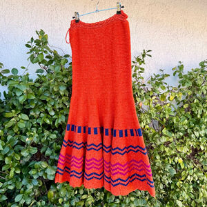 Stunning crochet knit midi skirt by VALENTINO GARAVANI, featuring a drawstring tie-waist detail, a fitted mermaid silhouette and flared hem. Predominately bright reddish orange with a dark blue and purple / pink striped and chevron pattern. 100% Virgin Wool