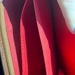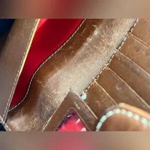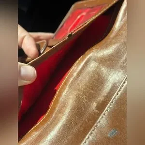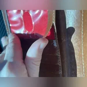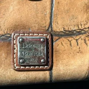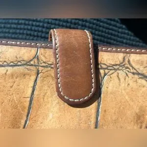 Dooney & Bourke croc-embossed leather wallet in warm tan tones. Snap closure with stitched trim. Metal logo plate on front. Sleek, organized design for cards and bills. Classic look that pairs with many styles. Flaw in pic leather torn but halted not still tearing