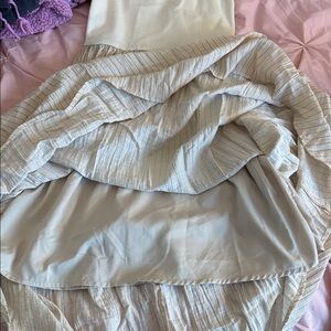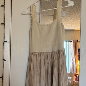 Sleeveless maxi dress by mine. Scoop neckline with scalloped straps. Fitted cream bodice with a tan gathered skirt. Lightweight and flowy silhouette. Simple, neutral look for everyday wear.