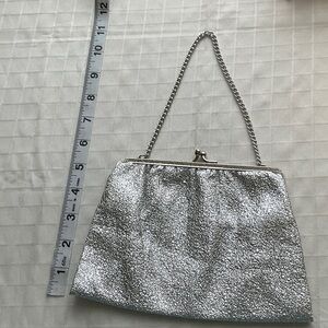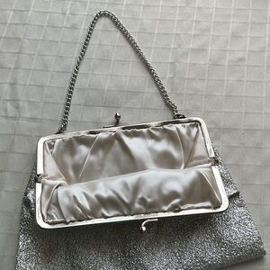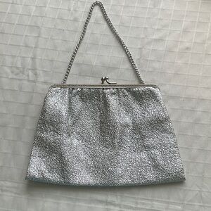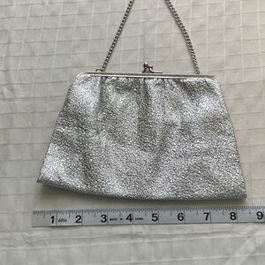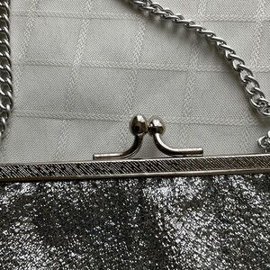 Chic silver glitter metallic evening clutch purse with a textured finish. Sleek chain handle for easy carry. Clasp closure. Lined. Perfect for evening events and special occasions. Stylish silver color adds sparkle to any outfit.