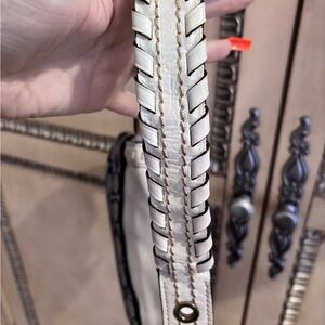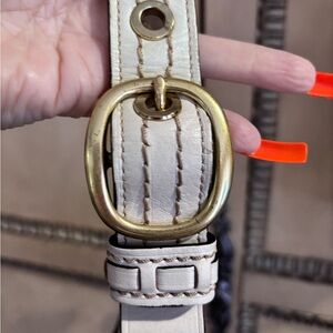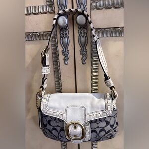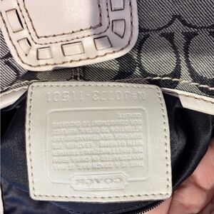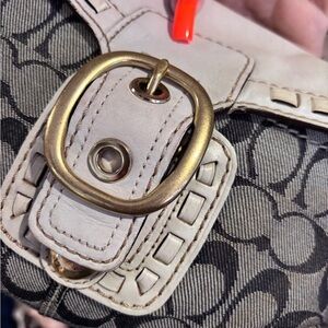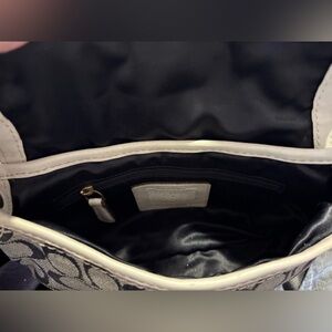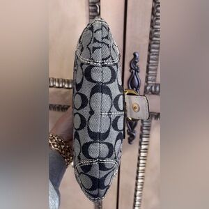 Highly sought after Coach bleeker denim bag. In over all really good condition. There are some scuffs on the hardware. PLEASE SEE THE PICS. The bag has been thoroughly cleaned, leather conditioned, and hardware polished. There are no rips, stains, or tears. 10x7 with a 9 inch shoulder drop. Fits comfortably on the shoulder.