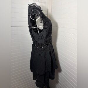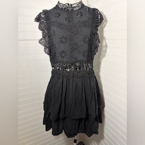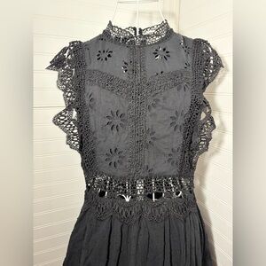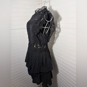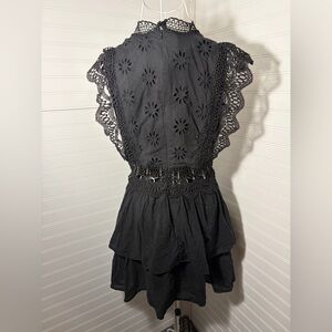 Stunning mini dress with crochet lace and eyelet panels. Cap sleeves with scalloped edges. Fitted waist with delicate cutout trim. Soft layered skirt for light movement. Elegant black tone ideal for evenings. Excellent Preloved Condition.