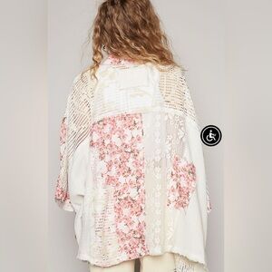 Elegant POL kimono with floral patterns. Features a mix of white and pink hues. Perfect for layering.