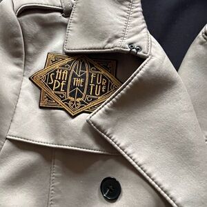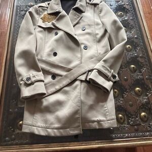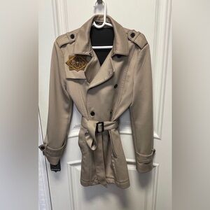 Timeless double-breasted trench coat in a warm tan color. Belted waist and button cuff details. Clean, tailored silhouette with a notched collar. Versatile outerwear for everyday wear.