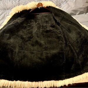 Stylish green suede coat with plush cream shearling trim. Feminine floral embroidery adds elegant detail. Soft suede exterior and cozy shearling interior for warmth and comfort. Classic silhouette perfect for elevated everyday wear.