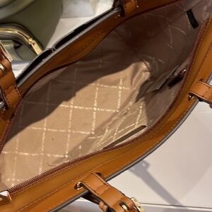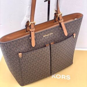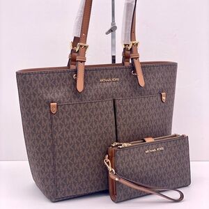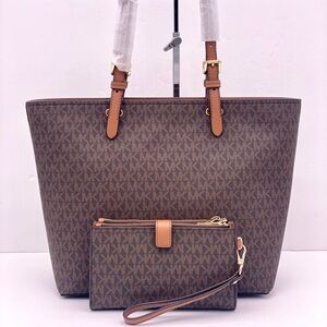 Stylish brown tote with matching wristlet. Iconic MK monogram design. Perfect for everyday use.