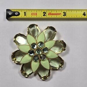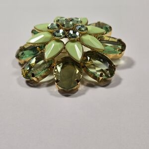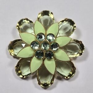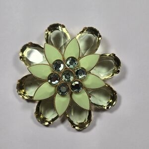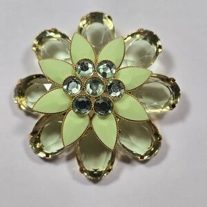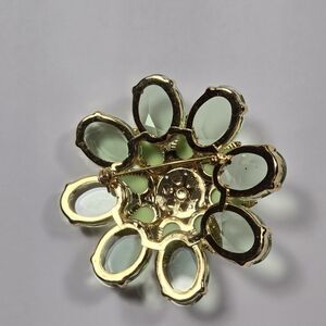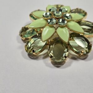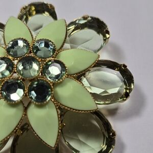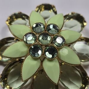 Demensional Vintage Light green floral brooch with gold-tone trim and pale green crystals.