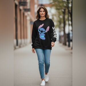 73 Disney Stitch sweatshirt in size 1X, featuring a large colorful Stitch graphic on the front and “STITCH” text down the sleeve. Super cute and cozy pullover style, perfect for casual wear, Disney fans, or lounging.
