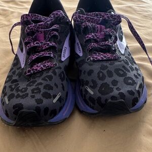 Brooks athletic shoes with a black leopard-print upper and purple accents. Padded collar and cushioned midsole for comfort. Lace-up closure for a secure fit. Versatile style for runs or everyday wear.