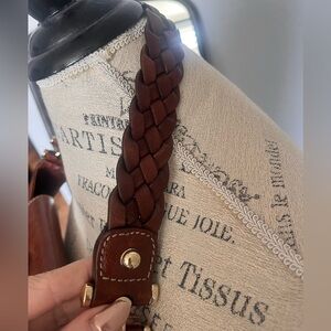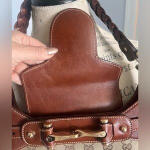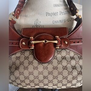 Classic Gucci monogram canvas body. Love the brown leather trim and the braided shoulder strap is my favorite feature. Gold-tone horsebit detail at front.