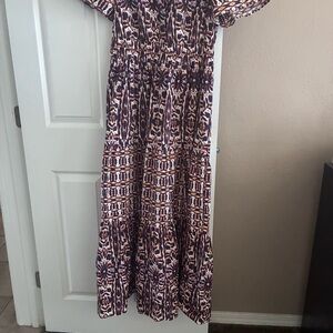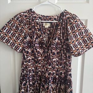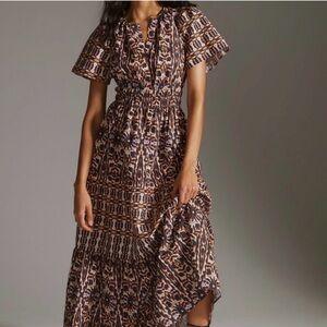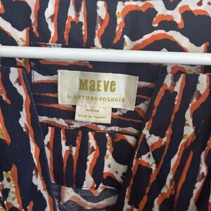 Anthropologie Maeve Short-Sleeve Somerset Maxi Dress, Orange/Navy, Size Medium, smocked detailing at waist, pit to pit is about 17.5 inches, waist is 15 inches, excellent used condition